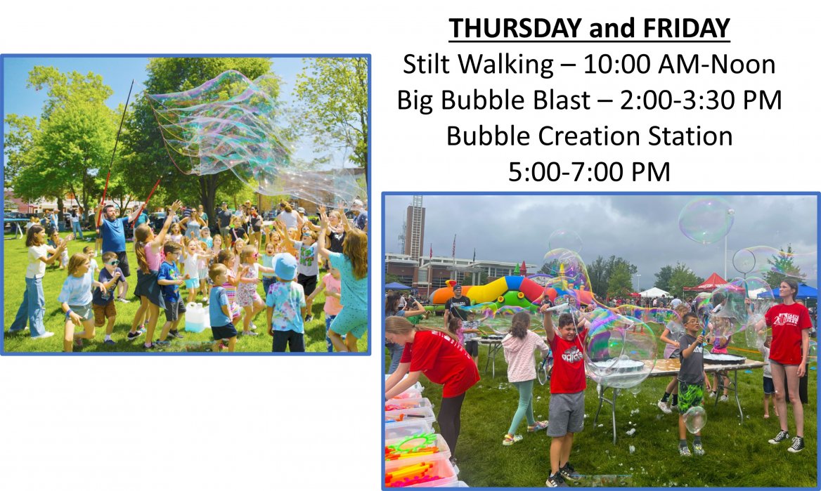 2-3:30pm: Big Bubble Blast (I make the bubbles, kids chase and pop them, interaction with kids)